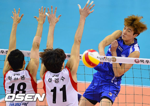 19일 오후 경북 구미 박정희체육관에서 열린 2013-14시즌 NH농협 V리그 남자부 LIG손해보험과 대한항공의 경기, 2세트 대한항공 곽승석이 강타를 날리고 있다