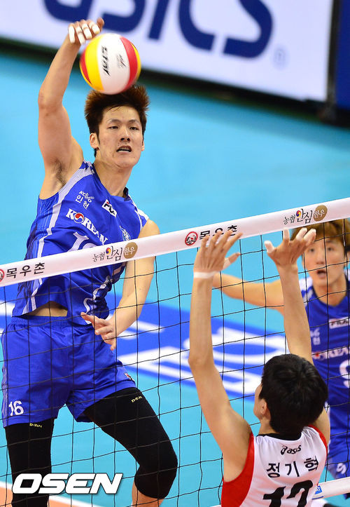 19일 오후 경북 구미 박정희체육관에서 열린 2013-14시즌 NH농협 V리그 남자부 LIG손해보험과 대한항공의 경기, 2세트 대한항공 진상헌이 강타를 날리고 있다