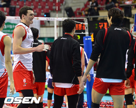 LIG는 19일 구미 박정희체육관서 열린 NH농협 2013~2014 프로배구 V리그 3라운드 대한항공과의 경기에서 세트스코어 3-1(28-26 28-26 20-25 25-22)로 이겼다.