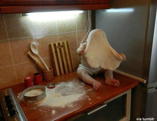 피자를 망친 아기라는 제목으로 온라인 커뮤니티에 올라온 사진에는 한 아기가 주방 식탁에 앉아있다. 그런데 이 아이는 누군가가 정성들여 만들어 놓은 피자 도우를 뒤집어 쓰고 있다.