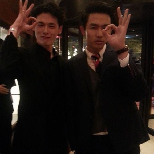 공개된 사진 속 임슬옹은 모델 김원중과 함께 엄지와 검지를 이용해 원을 그리고 있는 모습이다. 큰 키와 수트 패션으로 모델 포스를 풍기고 있다.