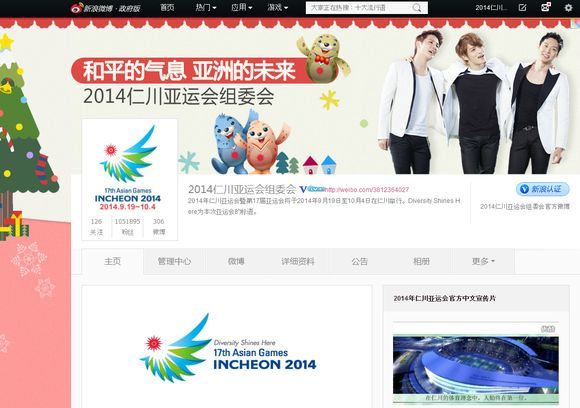 2014 인천아시아경기대회 조직위원회(위원장 김영수)의 중국판 트위터 웨이보(http://weibo.com/2014agincheon)의 팔로어가 100만 명을 돌파했다.