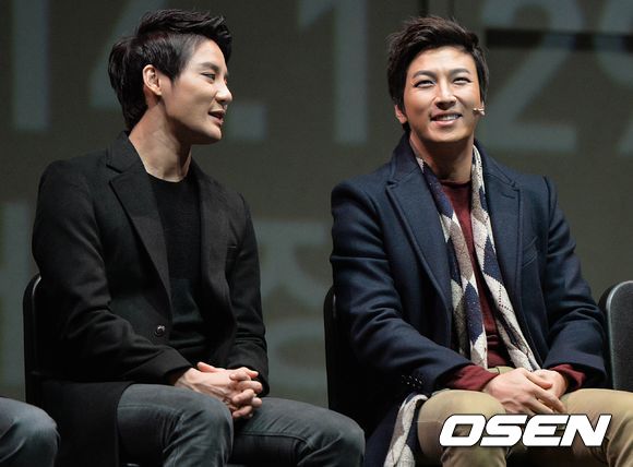 김준수와 박건형이 20일 오후 서울 세종로 세종문화회관에서 열린 뮤지컬 '디셈버: 끝나지 않는 노래'(이하 '디셈버') 프레스콜에서 미소짓고 있다.
