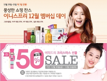 [OSEN=이슈팀]메이크업 전문 브랜드 '이니스프리'(Innisfree)와 '에뛰드하우스'(ETUDE HOUSE)가 크리스마스 기념 세일을 시작했다.