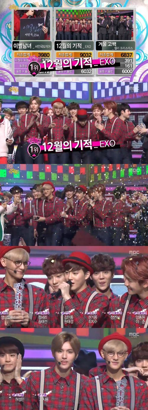 엑소는 21일 방송된 MBC '쇼! 음악중심'에서 젤리크리스마스의 '겨울 고백'과 서인국&지아의 '이별남녀'를 제치고 '12월의 기적'으로 1위의 영광을 안았다.