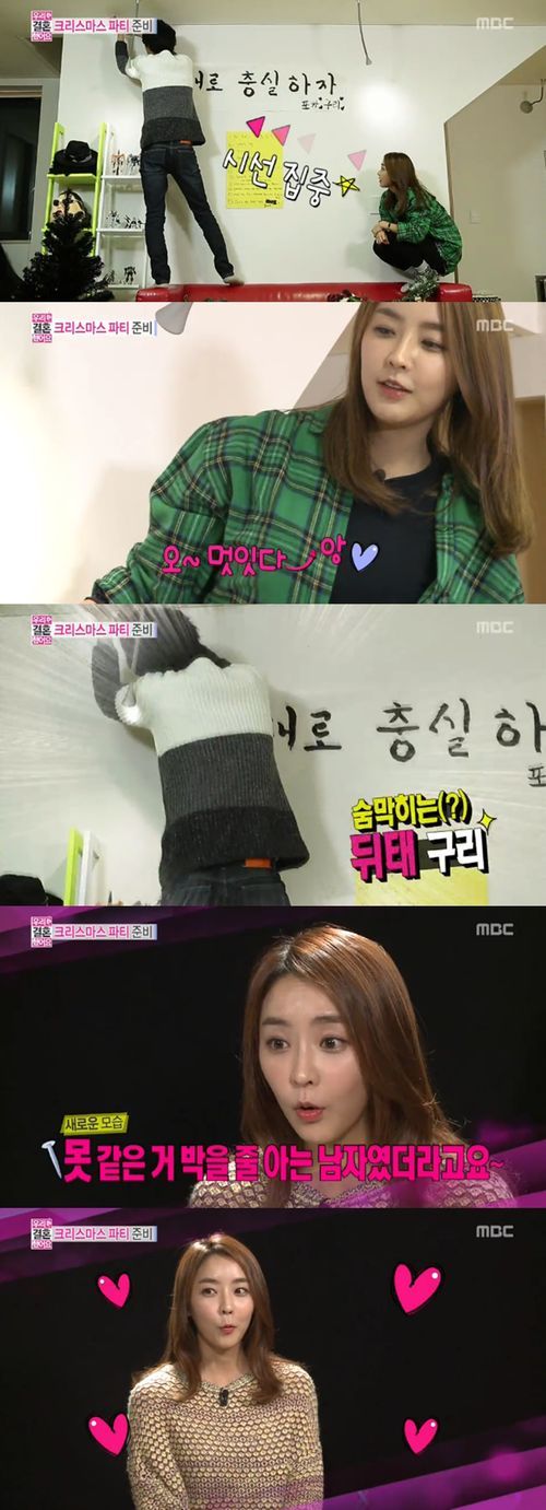 정준영은 평소와 달리 적극적으로 벽에 못을 박기 시작했고 정유미는 정준영에게 눈을 떼지 못했다.