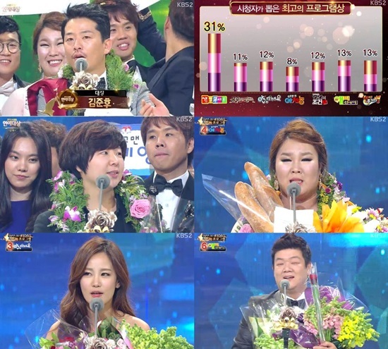 이날 시상식에서 '개그콘서트'는 대상과 프로그램의 대상격인 시청자가 뽑은 최고의 프로그램상을 동시에 안았다. 지난 1999년부터 '개그콘서트' 무대를 지켜온 김준호가 대상의 주인공이 되며 노력의 결실을 맛봤고, 올해까지 3년연속 최고 프로그램상의 소감은 '개그콘서트'의 몫이었다. 가히 2013 KBS 연예대상의 주인공이라 칭해도 모자람이 없는 성적이었다.