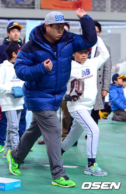 류현진이 야구 유소년들에게 투구폼을 보여주고 있다.