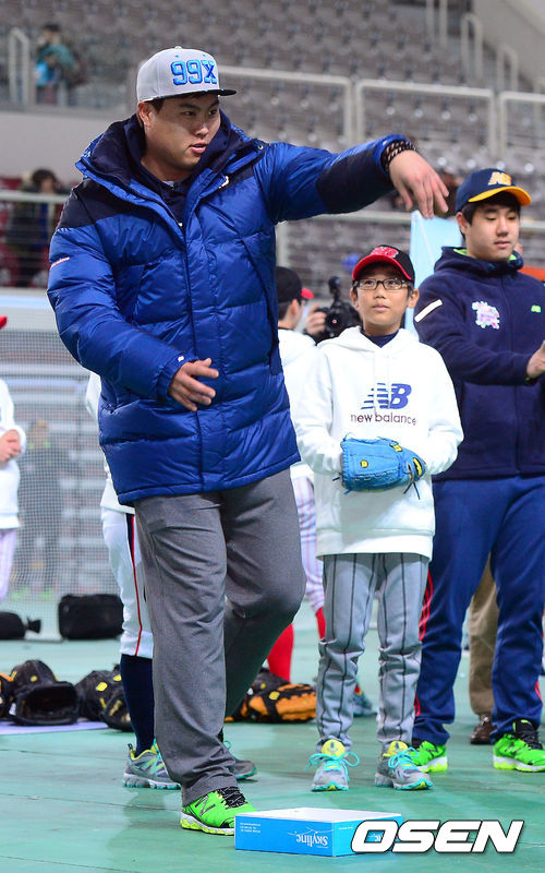 류현진이 어린 선수에게 투구 자세를 설명하고 있다.