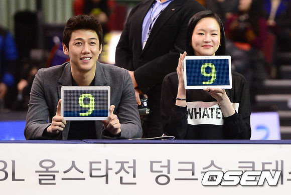경기에 앞서 열린 덩크슛 콘테스트 예선에서 심사위원으로 참석한 우리동네 예체능 김혁과 이혜정이 점수를 보이고 있다.