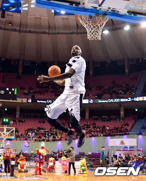 22일 오후 서울 잠실동 잠실실내체육관에서 열린 'KB국민카드 2013-2014 프로농구 올스타전' 경기에 앞서 덩크슛 콘테스트 예선에서 리차드슨이 덩크슛을 시도하고 있다.