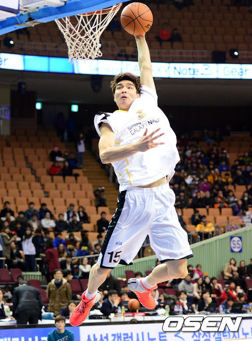 경기에 앞서 열린 덩크슛 콘테스트 예선에서 드림팀 김종규가 덩크슛을 하고 있다.