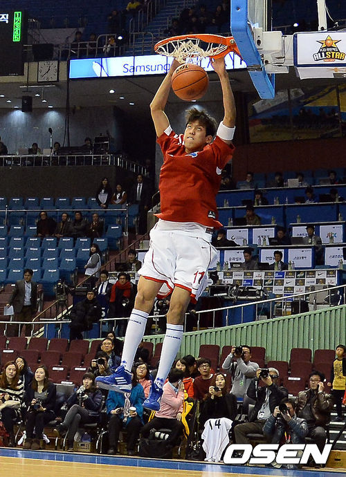 경기에 앞서 열린 덩크슛 콘테스트 예선에서 연세대 최준용이 덩크슛을 하고 있다.