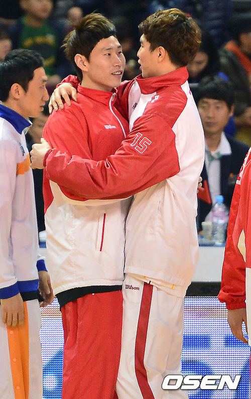 22일 오후 서울 잠실동 잠실실내체육관에서 열린 'KB국민카드 2013-2014 프로농구 올스타전' 경기, 오세근과 김종규가 포옹을 하고 있다.