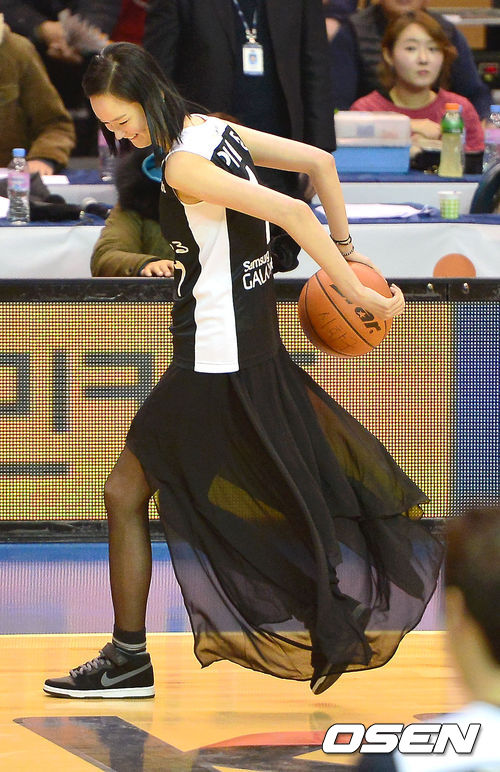 22일 오후 서울 잠실동 잠실실내체육관에서 열린 'KB국민카드 2013-2014 프로농구 올스타전' 경기, 모델 이혜정이 시구에 앞서 드리블을 하고 있다.