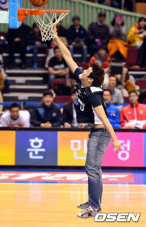 22일 오후 서울 잠실동 잠실실내체육관에서 열린 'KB국민카드 2013-2014 프로농구 올스타전' 경기, 김혁이 시구로 덩크슛을 시도하고 있다