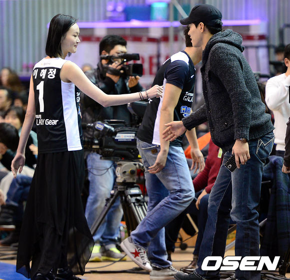 경기에 앞서 우리동네 예체능 이혜정이 시구를 마치고 우지원 코치와 인사를 나누고 있다.