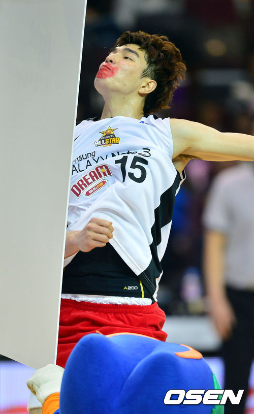 22일 오후 서울 잠실동 잠실실내체육관에서 열린 'KB국민카드 2013-2014 프로농구 올스타전' 경기 1쿼터 종료 이벤트 행사에서 김종규가 점프를 하고 있다.