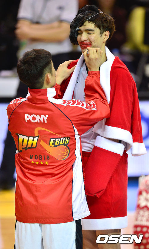 22일 오후 서울 잠실동 잠실실내체육관에서 열린 'KB국민카드 2013-2014 프로농구 올스타전' 경기 1쿼터 종료 이벤트 행사에서 양동근이 김종규에게 립스틱을 바르고 있다.