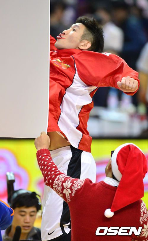 22일 오후 서울 잠실동 잠실실내체육관에서 열린 'KB국민카드 2013-2014 프로농구 올스타전' 경기 1쿼터 종료 이벤트 행사에서 양동근이 립스틱을 바른채 서전트점프를 하고 있다