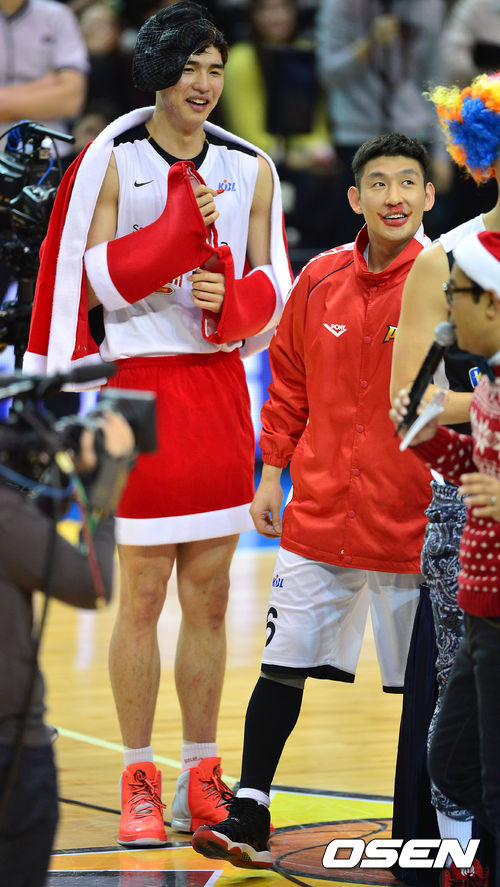 22일 오후 서울 잠실동 잠실실내체육관에서 열린 'KB국민카드 2013-2014 프로농구 올스타전' 경기 1쿼터 종료 이벤트 행사에서 양동근이 김종규를 산타복으로 변장 시킨후 미소 짓고 있다.