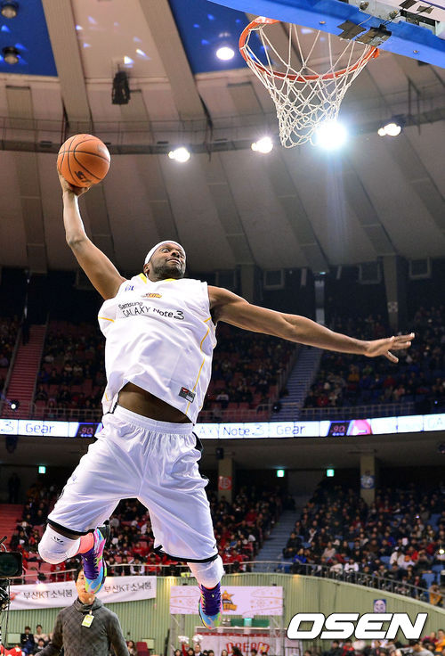 22일 오후 서울 잠실동 잠실실내체육관에서 열린 'KB국민카드 2013-2014 프로농구 올스타전' 경기 하프타임 덩크슛 콘테스트에서 벤슨이 덩크슛을 시도하고 있다.