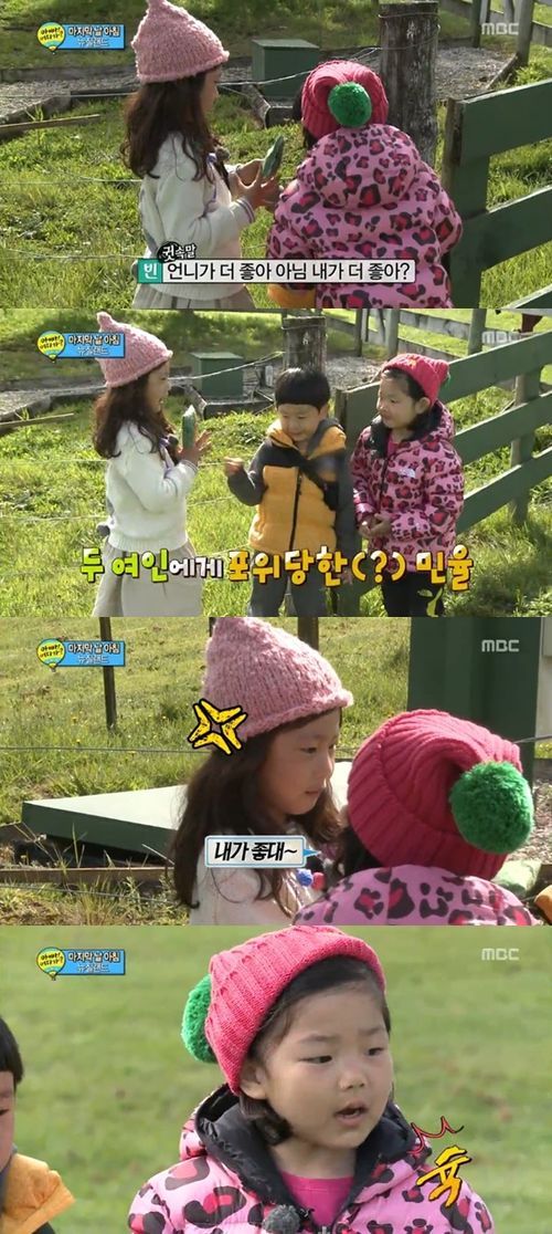 김민율은 22일 방송된 MBC 예능프로그램 ‘일밤-아빠 어디가’에서 성동일의 딸 성빈과 송종국의 딸 송지아 중 누가 더 좋은지 선택해야 하는 기로에 서게 됐다.
