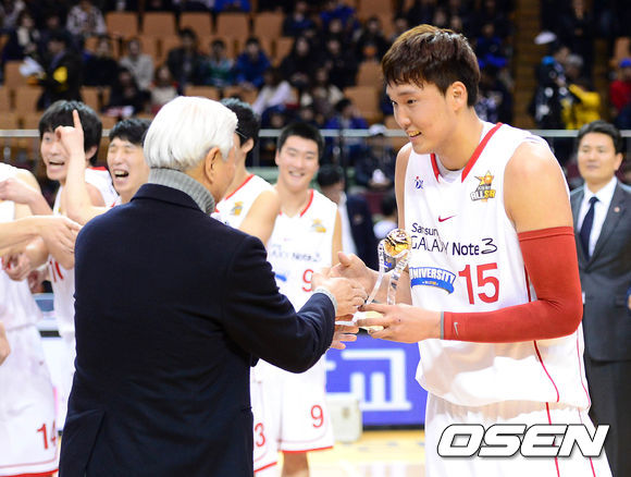 경기 종료 후 MVP를 수상한 대학올스타 이종현이 방열 대한농구협회장으로부터 트로피를 건네받고 있다.