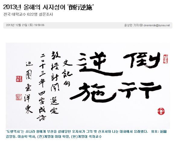 [OSEN=이슈팀] 교수들이 선정한 올해의 사자성어는 무엇일까. 바로 '순리를 거슬러 행동한다'는 뜻의 도행역시(倒行逆施)다.
