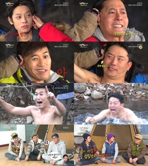 허탈한 미션에 멤버들은 당황했고, 단 한번의 기회를 실패로 마무리하며 아쉬움을 드러냈다. 결국 멤버들은 제작진과의 협의 하에 계곡물에 입수할 경우 한 번의 기회를 더 얻을 수 있다는 조건을 만들어냈고, 김준호와 김종민이 차례로 입수하며 텐트를 얻어냈다.