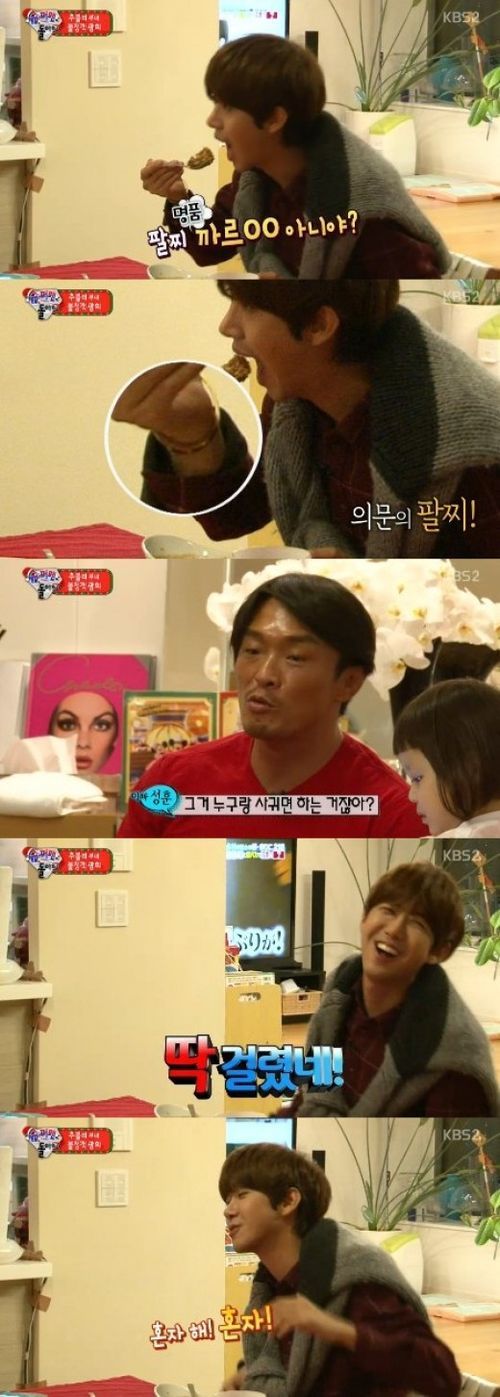 추성훈은 광희의 손목에 있는 팔찌를 보고 "그거 누구랑 사귀면 하는 거 아니냐?"고 콕 집어 물었다.