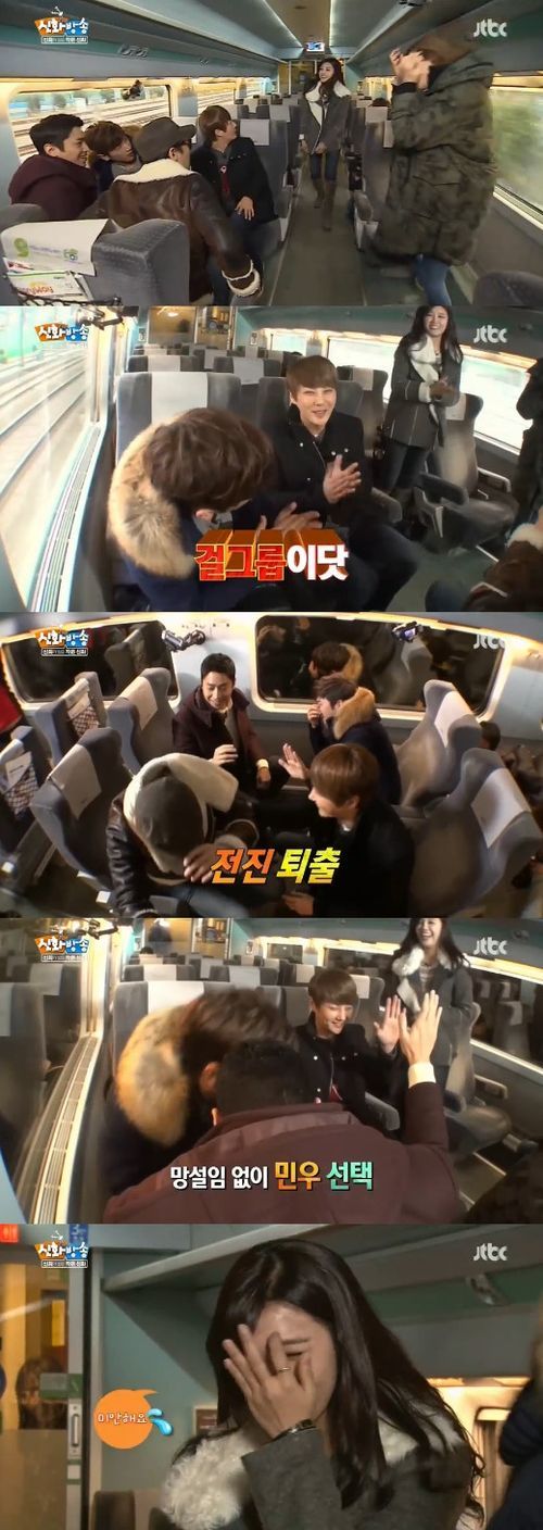 이를 위해 전진은 정은지와 리지에게 함께 앉고 싶지 않은 멤버를 창가로 방출하라고 제안했다. 이에 리지는 큰 고민없이 전진을 퇴출했고, 정은지는 이민우를 지목했다. 이에 이민우는 “니 알아봤데이”라는 어설픈 사투리로 불만을 표출해 웃음을 자아냈다.