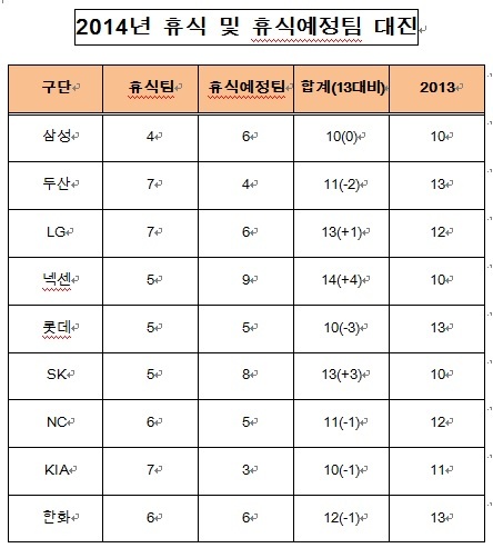 2014 프로야구가 내년 3월29일 개막해 팀당 128경기씩 소화한다.