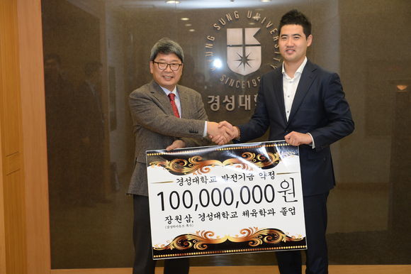 경성대는 지난 23일 보도자료를 통해 '장원삼(2006년 스포츠건강학부 졸업) 동문이 23일 모교를 방문해 후배들과 대학의 발전을 위해 발전기금 1억 원을 후원 약정했다'고 전했다.