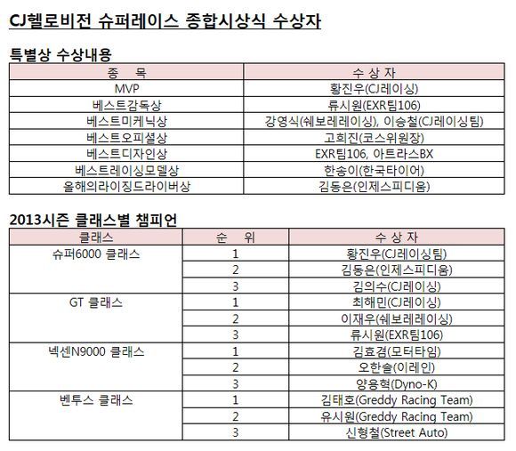 이 밖에 올해의 라이징 드라이버는 슈퍼6000 최연소 드라이버인 인제스피디움의 김동은(22)이, 올해 처음 신설된 베스트 디자인 상은 EXR팀106과 아트라스BX팀이 함께 선정됐다.