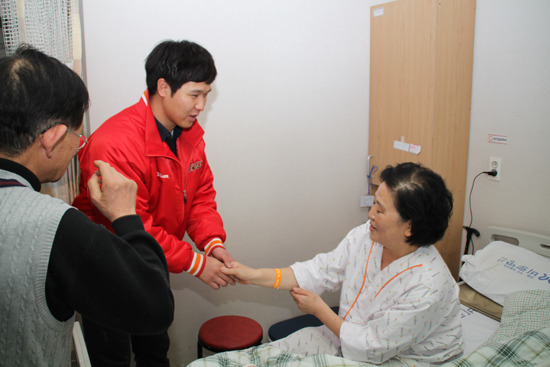 SK와이번스의 최정이 23일 인천 남구에 위치한 바로병원을 방문하여 인공관절(퇴행성 관절염) 수술 환자들을 위문했다.