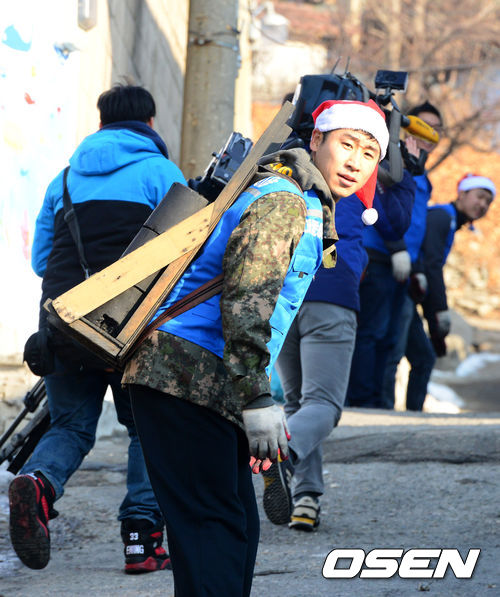 이근호가 지게를 메고 연탄을 배달하고 있다.