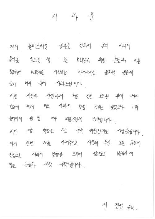 음주파문을 일으켰던 한국여자프로골프(KLPGA) 이정연(34)이 자필 사과문을 올렸다.