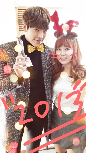 공개된 사진 속 김우빈은 트로피를 손에 쥔 채 루돌프로 변신한 하지영과 함께 카메라를 응시하고 있다. 특히 둘의 다정한 표정과 포즈가 눈길을 끈다.