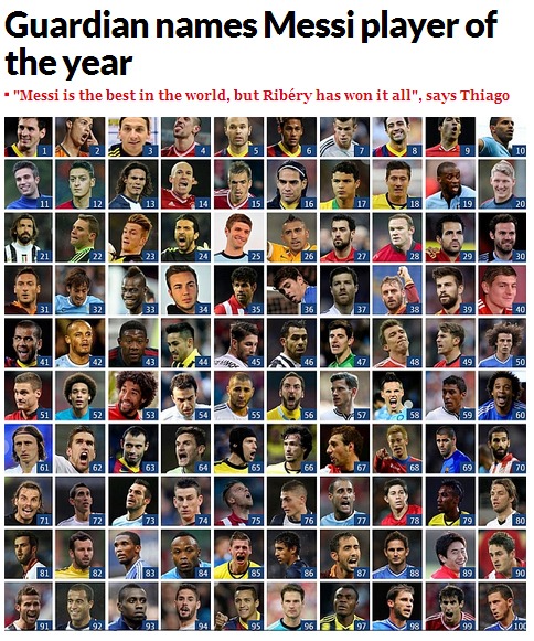 영국 가디언은 25일(한국시간) '2013년 세계 최고의 축구선수 100명'을 선정해 발표했다. 이는 세계적인 축구 전문가 패널에게 올해 활약상을 물어 선정한 것이라고 설명했다.