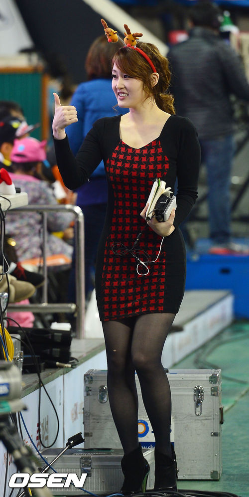 경기 전 SBS ESPN 아나운서 신아영이 최고라는 사인을 보내고 있다.