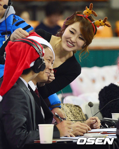 경기 전 SBS ESPN 아나운서 신아영이 조성원 해설위원에게 산타모자를 해주고 있다.