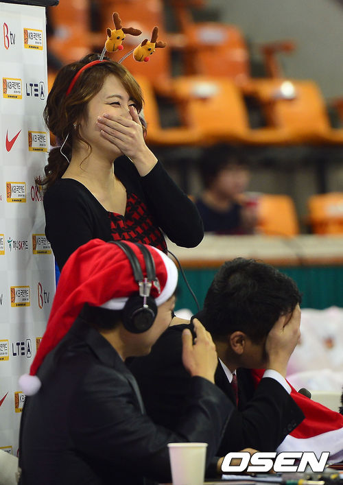 경기 전 SBS ESPN 아나운서 신아영이 조성원 해설위원에게 산타 모자를 씌워준 후 환하게 웃고 있다.