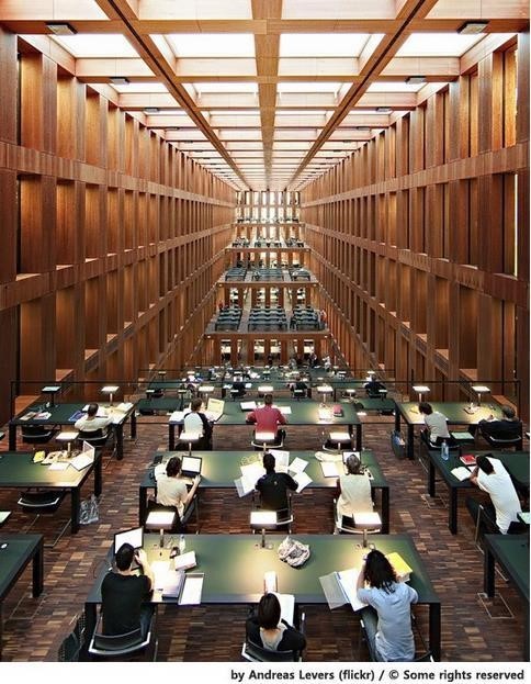 '잠잘 수 없는 도서관'이라는 제목의 이 도서관 사진은 사방이 트인 독특한 구조를 갖추고 있다. 칸막이 하나 없이 탁 트인 테이블은 물론이고 각 열람실 끼리도 모두 개방 돼 있어 다른 열람실에서 무슨 일이 일어나고 있는 지 한눈에 다 알 수 있게 돼 있다.
