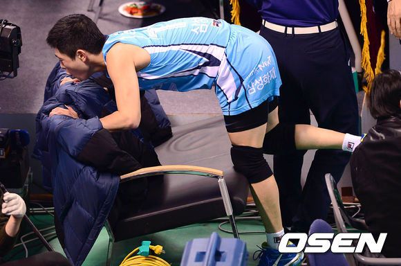2세트 삼성화재 김강녕이 공을 따라가다 관중석으로 넘어지고 있다.