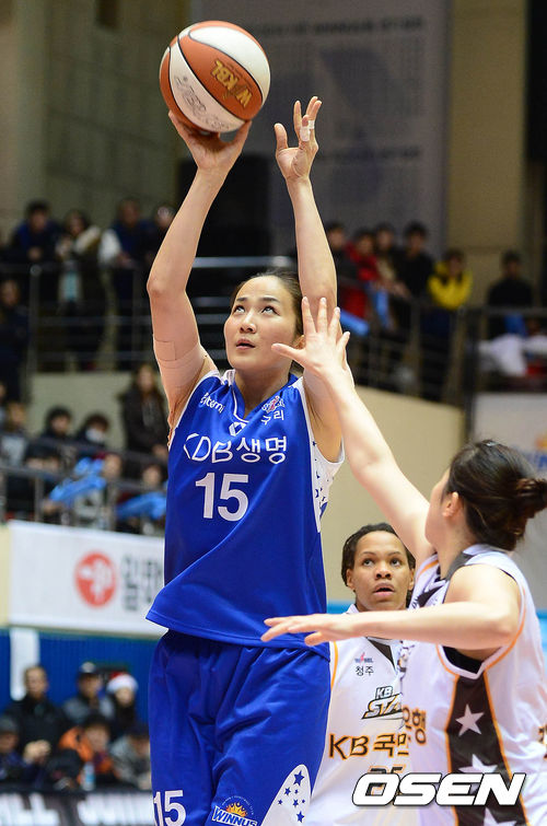 25일 오후 구리시체육관에서 열린 '우리은행 2013-2014 여자프로농구' 구리 KDB생명과 청주 KB스타즈의 경기 1쿼터 신정자가 슛을 시도하고 있다.