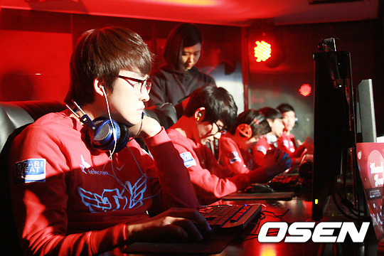 SK텔레콤 T1 K는 25일 서울 용산 온게임넷 e스포츠 상설경기장에서 열린 삼성전자 블루와 '판도라TV LOL 챔피언스(이하 롤챔스)' 윈터 2013-2014 8강 1세트 경기서 쓰레쉬를 잡은 '푸만두' 이정현을 중심으로 기막힌 조직력을 발휘하면서 먼저 1점을 챙겼다.