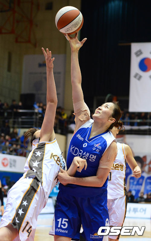 25일 오후 구리시체육관에서 열린 '우리은행 2013-2014 여자프로농구' 구리 KDB생명과 청주 KB스타즈의 경기 2쿼터 신정자, 김수연이 리바운드 다툼을 하고 있다.