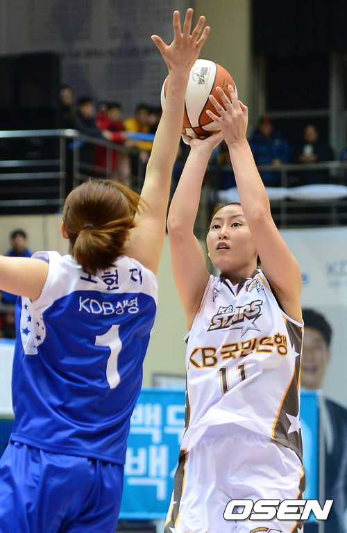 25일 오후 구리시체육관에서 열린 '우리은행 2013-2014 여자프로농구' 구리 KDB생명과 청주 KB스타즈의 경기 4쿼터 이경희가 노현지를 앞에두고 슛을 시도하고 있다.