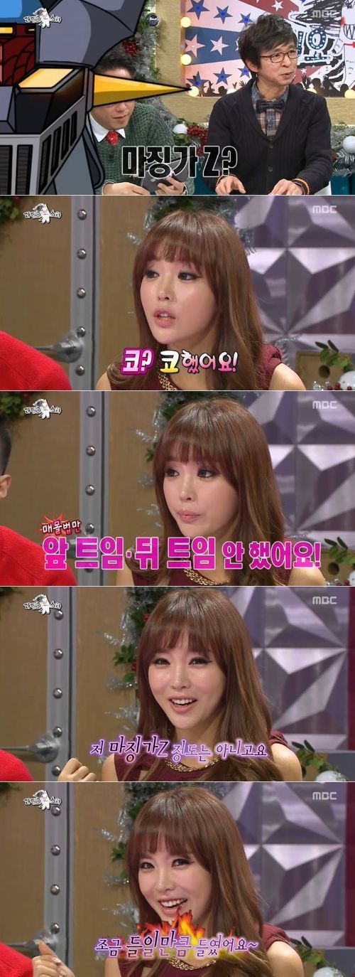 이에 MC 규현은 "3군데 이상이냐, 이하냐?"고 물었고, 홍진영은 "코 2번했다. 눈도 집었다. 앞트임고 뒷트임은 하지 않았다"고 '마징가Z'설을 일축했다.